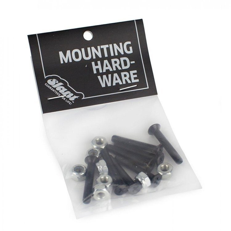 Montażówki dzięki którym przymocujesz trucki do blatu. Wykonane z wysokiej klasy materiału. Zestaw 8 sztuk montażówek z płaskim łbem i 8 sztuk nakrętek.
