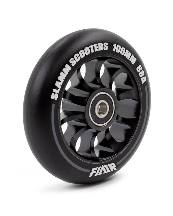 Koła Slamm Flair 2.0 o średnicy 100 mm z rdzeniem ze stopu metali są doskonałym, lekkim i wytrzymałym elementem dla każdej kompatybilnej hulajnogi do trików. Elastyczne kółka twardości 88A Super High Rebound Mi-T są super wydajne, przyczepne i wytłumiające lądowania. Slamm Flair 2.0 są dostępne w różnych kolorach anodyzowanego metalu i wyposażone są w gumowe osłonki oraz wodoodporne łożyska ABEC-9 Chrome, dające najpłynniejszą jazdę.