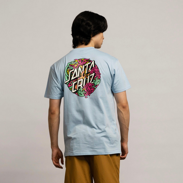 T-Shirt posiada nadrukowaną na lewej piersi i bardziej widoczną na plecach serpentynową wersję klasycznego logo Santa Cruz Dot.