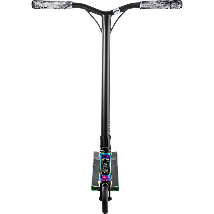 Jej wyjątkowe cechy to lekki widelec NKD i duże kółka średnicy 120mm, z rdzeniem typu hollow. Takie zawieszenie jest specjalnie przeznaczone do CIĘŻKIEJ jazdy! Zastosowanie plastikowego hamulca dodatkowo wydłuża żywotność tych nowoczesnych kółek i zmniejsza ryzyko kontuzji przy cięższym lądowaniu stopy na hamulcu. Z podestu wycięte zostały dropout’y w okolicach gryfu, zacisku i spodu podestu, by zredukować wagę i zwiększyć komfort manipulacji hulajką, podczas powietrznych ewolucji. Zmodyfikowany w ten sposób kształt podestu tym bardziej upraszcza grindy i ślizgi na rurkach i poręczach. Z środka podestu patrzy na nas wygrawerowane logo NKD, w chromowanym designie.