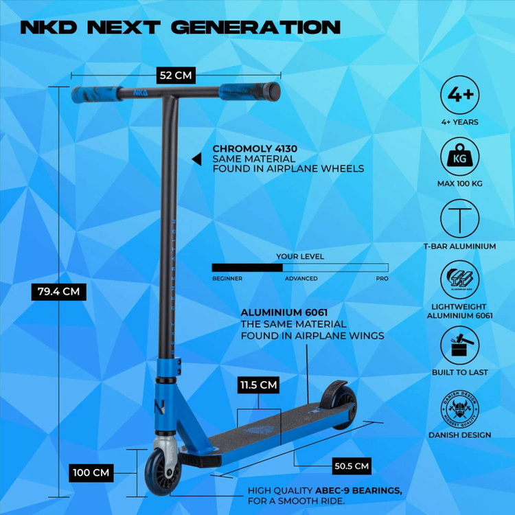NKD Next Generation to dokładnie przetestowana, wysokiej jakości hulajnoga kaskaderska z atestem SGS. Hulajnoga jest przeznaczona do ulicznych i skateparkowych akrobacji na railach i rampach. Jest ona idealna dla początkujących, młodych riderów, którzy chcą się rozwijać i stać się najlepszymi zawodowcami na jednej i tej samej hulajnodze. Kolejne młode pokolenie freestyle'owych riderów wkrótce szturmem zdobędzie scenę zawodowców! Dzięki tej hulajnodze wyczynowej, NKD umożliwiło młodym zawodnikom sprawdzenie swoich umiejętności i wykonywanie takich samych akrobacji, jak profesjonaliści najwyższej klasy!