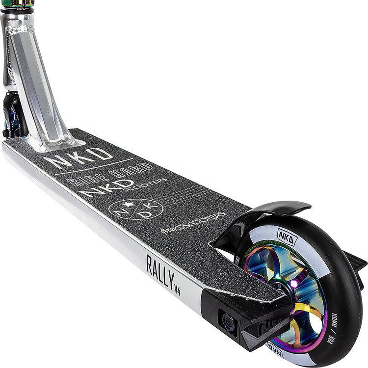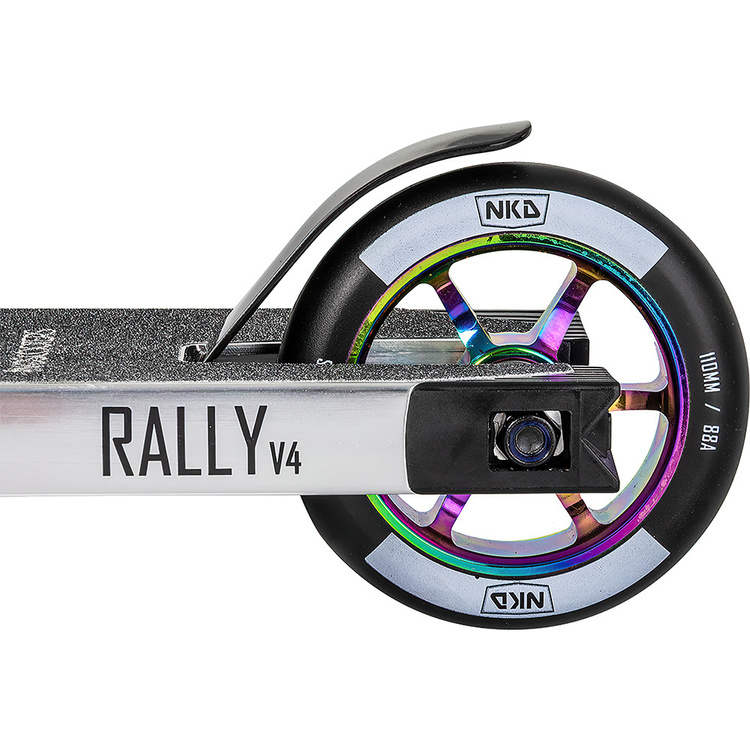 Najwyższe standardy produkcji w NKD Rally V4 to między innymi najlepsza jakość materiałów. Model ten posiada podest ze wzmocnionymi szynami do rail grindów wykonany z wysokiej jakości aluminium, o długości 490 mm i szerokości 120 mm. Jest wyposażony również w wysokiej jakości stery zintegrowane.