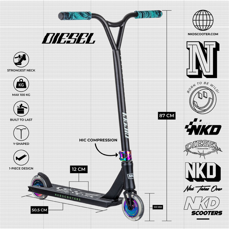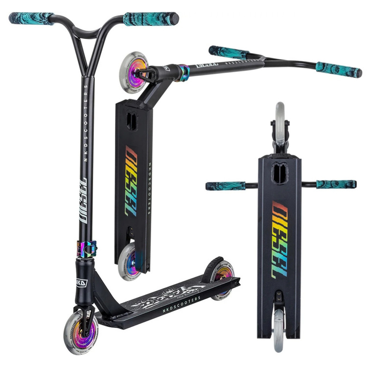 NKD Diesel Stunt Scooter to hulajnoga wyczynowa przeznaczona zarówno do jazdy w skateparku jak i na ulicy, o całkowitej wysokości 87 cm. Użyte w niej materiały sprawiają, że jest to bardzo solidny model, który wytrzyma wiele ciężkich sesji na skateparku, a waży 4100 tylko gramów (4,1 kg).