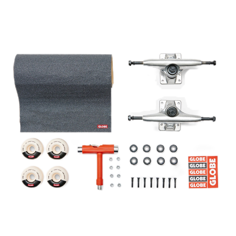 • Kompletny zestaw od Globe, który zawiera wszystko, czego potrzebujesz do swojego deskorolkowego decku, aby stworzyć kompletną deskorolkę: trucki Slant, kółka Globe G1 Street Wheels, łożyska ABEC-7, komplet montażówek, griptape oraz narzędzie Skate Tool.