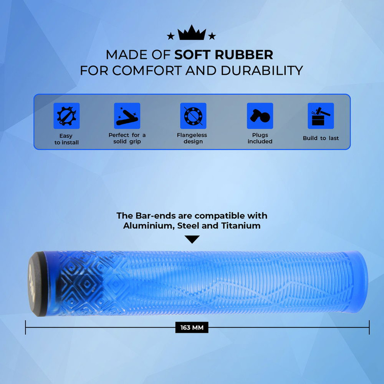 • NKD GOAT Grips to miękkie i wygodne gripy o długości 163 mm, które świetnie trzymają się w dłoni nawet przy ostrej jeździe. Pasują do większości kierownic i są dostępne w wielu kolorach, więc z łatwością dopasujesz je do swojego stylu.