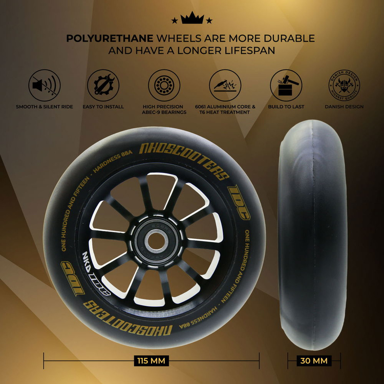 • Koła NKD IDC o średnicy 115 mm to solidna podstawa hulajnogi wyczynowej – aluminiowy rdzeń, łożyska ABEC-9 i twardość 88A dają maksymalną kontrolę i styl. Duńska precyzja i wytrzymały poliuretan sprawiają, że każdy trick to czysta przyjemność.