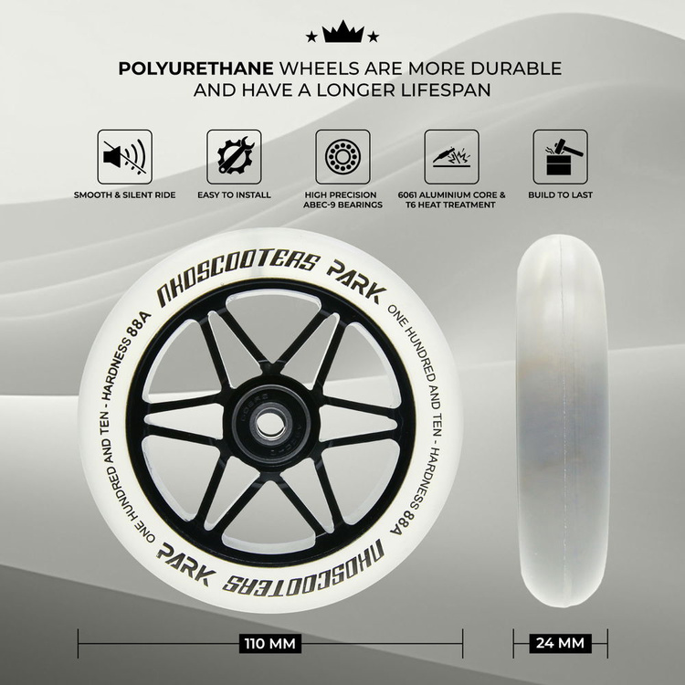 • Koła NKD Park o średnicy 110 mm to solidna podstawa hulajnogi wyczynowej – aluminiowy rdzeń, łożyska ABEC-9 i twardość 88A dają maksymalną kontrolę i styl. Duńska precyzja i wytrzymały poliuretan sprawiają, że każdy trick to czysta przyjemność.