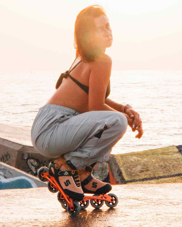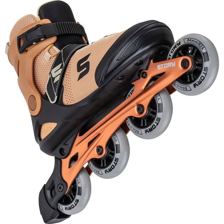 Mocna aluminiowa szyna umacnia konstrukcję i pomaga w prędkim przyspieszaniu za każdym razem gdy zbierasz się do jazdy. Zewnętrzna skorupa buta z twardego plastiku daje dobre oparcie stopie i pozwala na pewne uczucie kontroli. Wewnętrzna warstwa rolek zrobiona jest z pvc i miękkiej pianki by zwiększyć komfort i jak najlepsze dopasowanie nóg do butów. Kółka wielkości 84mm osadzone są na łożyskach ABEC7, więc przyjemny roll z łatwo dostępnymi wyższymi prędkościami i świetną zwrotnością są zagwarantowane :)