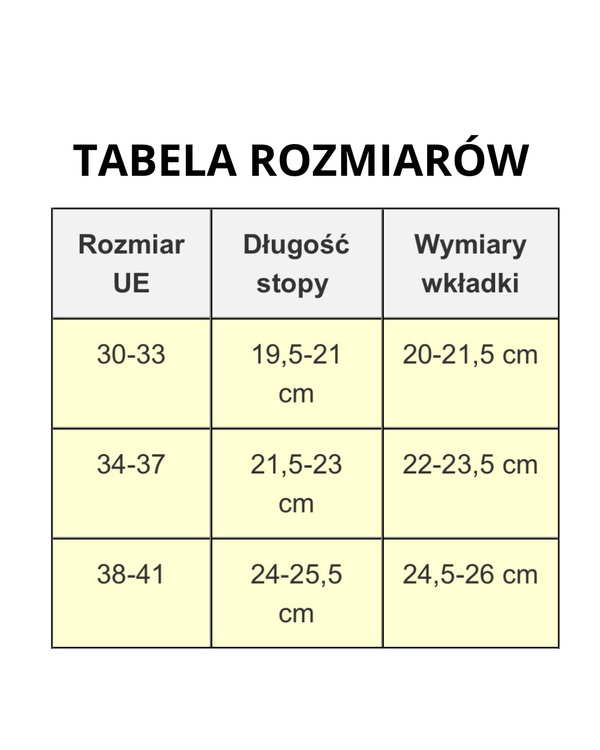 - Rozmiar S - EU: 30-33 / Długość stopy: 19,5-21 cm / Długość wkładki: 20-21,5 cm