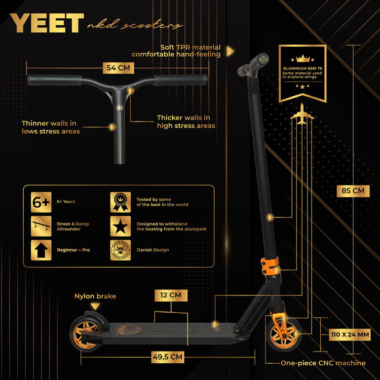 Dla ridera, który żyje aktywnie i potrzebuje sprzętu, który nadąża za jego rytmem. NKDscooters YEET to hulajnoga wyczynowa stworzona z myślą o stylu życia, który łączy codzienną mobilność z intensywną jazdą w skateparku. Jej design przyciąga wzrok, a konstrukcja – respekt. Zaprojektowana, testowana i zatwierdzona przez Pro Team NKD, ta hulajnoga wytrzyma każde lądowanie i każdy trick. Spód podestu wyposażony jest w szynę do grindowania, a wzmocniona szyjka sprawia, że deck jest niemal niezniszczalny. Jeśli Twoja codzienność to beton, poręcze i tempo miasta – YEET jest dla Ciebie.