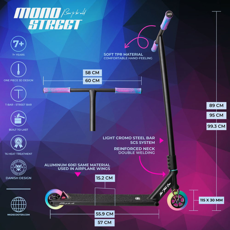 - Szerokie, wytrzymałe koła o średnicy 115 mm, szerokości 30 mm i twardości 88A zapewniają miękkie i łatwe lądowania oraz świetną przyczepność. Wyposażone są w rdzenie z aluminium 6061 T6, co gwarantuje niezwykłą trwałość, a ich okrągły profil zapewnia mniejszy opór. Dodatkowo street brake chroni tylne koło przed nieoczekiwanym zatrzymaniem