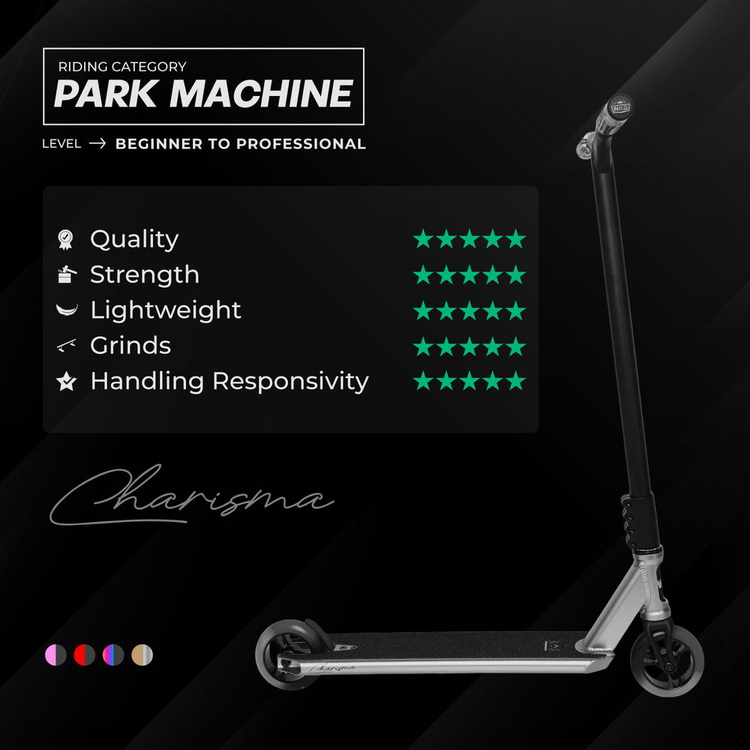RIZZ "Charisma" to nie tylko sprzęt – to manifest Twojego stylu życia. Wyróżnia się nie tylko zaawansowaną technologią, ale też nowoczesnym wyglądem, który przyciąga spojrzenia i inspiruje do działania. Griptape z mocnym klejem, smukły kształt i agresywna sylwetka podkreślają, że masz do czynienia z hulajnogą stworzoną do jazdy z charakterem. Jeżeli szukasz sprzętu, który dotrzyma Ci kroku na rampie, w mieście i w codziennym życiu – to właśnie znalazłeś.