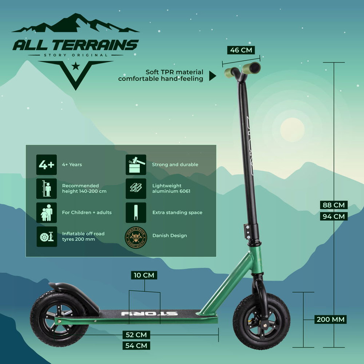 • Story All Terrains Dirt to hulajnoga terenowa, która idealnie nadaje się do jazdy w lesie lub na drodze. Hulajnoga jest rekomendowana dla dzieci i dorosłych o wzroście ok. 140-185 cm. Z pompowanymi kołami, możesz korzystać z niej praktycznie wszędzie!