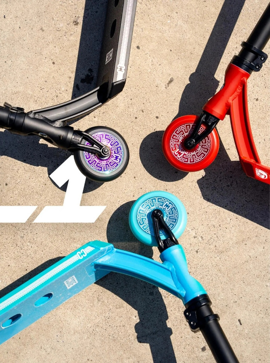 Hulajnoga wyposażona jest w gripy Core Slim Grips długości 170 mm, które zapewniają wysoki komfort dłoni i pewny chwyt, stworzone z myślą o długich, intensywnych treningach, gdzie kontrola i wygoda mają realne znaczenie przy nauce nowych tricków i dopinaniu combo.