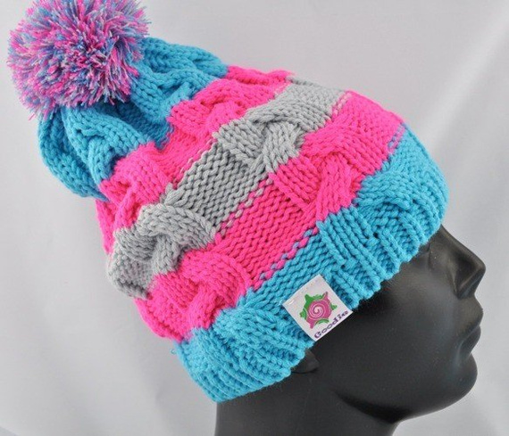 * Czapka wielokolorowa w paski: róż neon, turkus, jasny szary